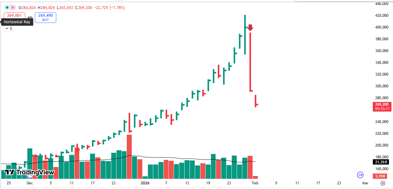 This rally in silver started in November 2025 and turned into a parabolic exhaustion move. Such moves do not restart immediately.